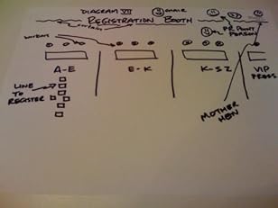 Kudos if you smoke out the conference producer and PR point people. (See diagram XII checkin booth lay-out). If they’re a self-published blogger or frequent commenter on TechCrunch/SiliconBeat/GigaOm, wax on about how you took notes on their comment.